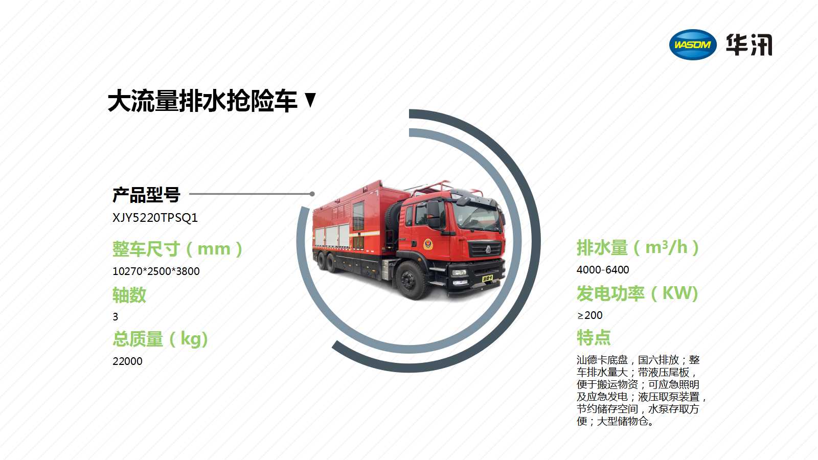 汕德卡底盘,国六排放;整车排水量大(4000-6400);带液压尾板,便于搬运物资;可应急照明及应急发电;液压取泵装置,节约储存空间,水泵存取方便;大型储物仓。