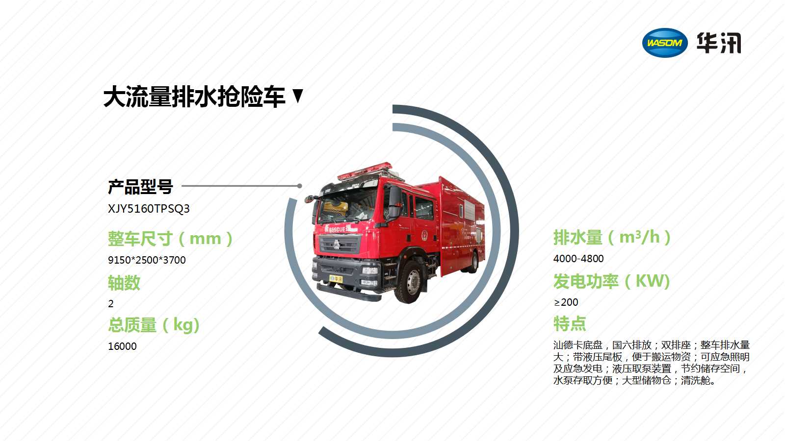 汕德卡底盘,国六排放;整车排水量大(4000-6400);带液压尾板,便于搬运物资;可应急照明及应急发电;液压取泵装置,节约储存空间,水泵存取方便;大型储物仓。
